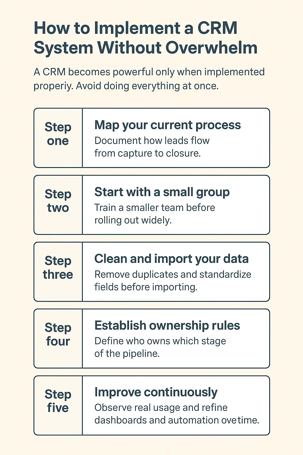 A well implemented CRM system turns this around. It gives you structure for your pipeline, accountability for your team, and a shared memory for your whole business.