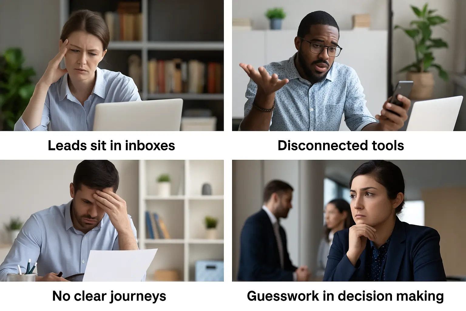 Contact forms, event lists and WhatsApp requests arrive, but no one has a structured way to follow up. Some leads are contacted many times, others never hear from you.