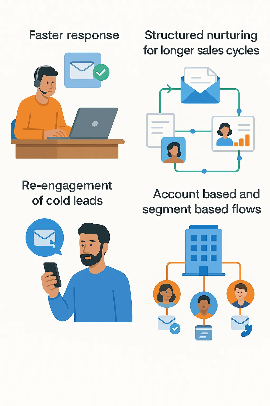 Automation is also very effective for re-engagement of cold leads. Contacts who went quiet after initial interest can be placed into a re-engagement journey that checks whether their situation has changed, offers updated content or a short consultation and captures feedback on why earlier discussions did not move forward.