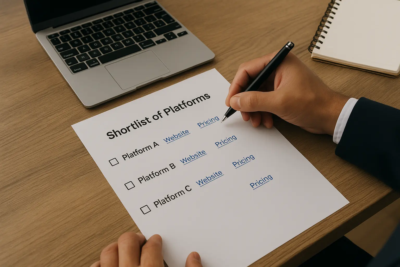 A shortlist of three to five platforms with links, pricing pages and contact persons that you will evaluate in depth.